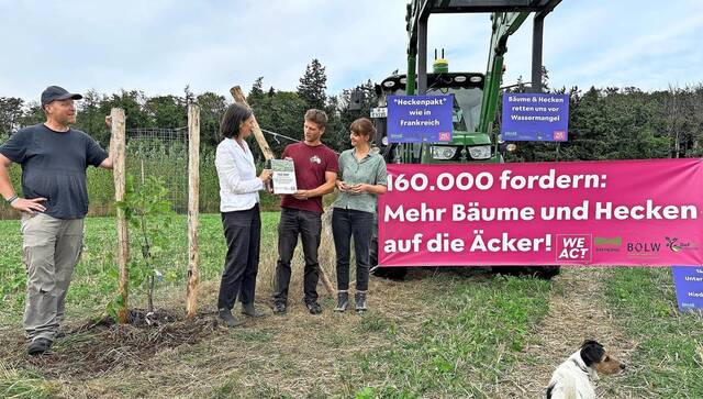 Lemmie. Fast 160.000 Menschen bundesweit, davon knapp 15.000 aus Niedersachsen, engagieren sich dafür, landwirtschaftliche Nutzflächen besser vor den Folgen des Klimawandels zu schützen. In einer Petition fordern sie, gezielt Bäume und Hecken auf die Äcker zu bringen, um die Böden vor Wasserverlust zu bewahren. Dass die Petition der BaumLand-Kampagne jetzt auf einem Acker in der Region Hannover bei Lemmie an Niedersachsens Landwirtschaftsministerin Miriam Staudte (Grüne) übergeben wurde, war kein Zufall.