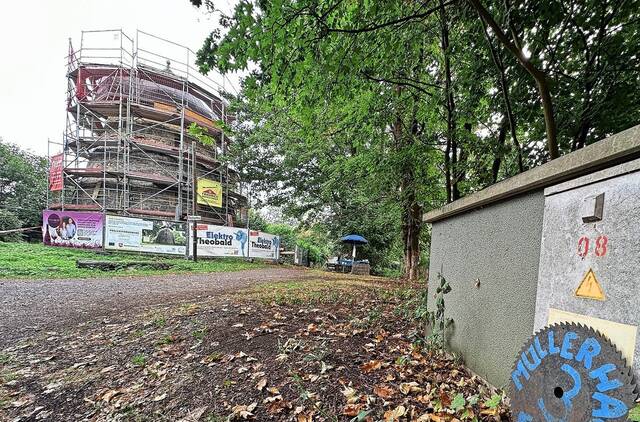 Eingerüstet: Der Verein Burgbergfreunde hat einen Pachtvertrag für die Mühle unterschrieben – mit dem Ziel, das 1878 errichtete Bauwerk zu sanieren. Künftig sollen ein Kaffee- und Biergarten, aber auch Kulturveranstaltungen regelmäßig Ausflüglerinnen und Ausflügler anlocken.Foto: Dirk Wirausky