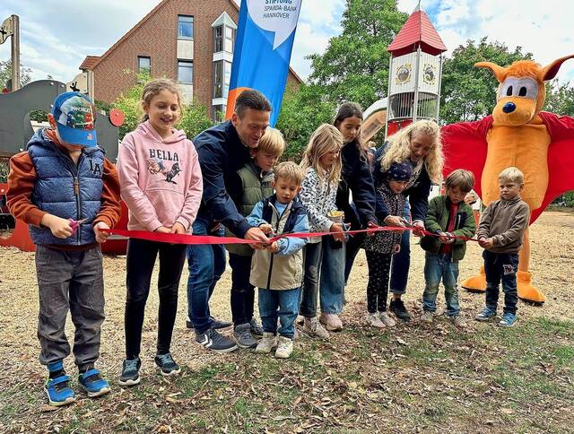 Am Ende sei die Fertigstellung eine Punktlandung gewesen. Die Rutsche sei erst diese Woche geliefert worden. „Das war ein knappes Ding“, so Losert. Gemeinsam mit Stefanie Rupprecht, Stiftungsmanagerin der Sparda-Bank Hannover, sowie mit Unterstützung zahlreicher Kinder und des Stadtmaskottchens Gehrda schnitt er symbolisch ein rotes Band durch – als Symbol der offiziellen Eröffnung.