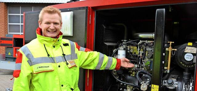 Die in Barsinghausen und Stadthagen stationierten Aggregate mit Dieselmotor leisten zwischen 110 und 124 Kilovoltampere (kVa), das entspricht einer elektrischen Leistung von etwa 88 bis 100 Kilowatt. „Wir können mit den Generatoren eine autarke Stromversorgung herstellen und auf diese Weise die kritische Infrastruktur funktionstüchtig halten“, erläutert Justin Waltersdorff, Gruppenführer der ASB-Fachgruppe für Technik, Logistik und Strom. Denkbar sei solch eine autarke Stromversorgung unter anderem für Einsatzleitstellen (Licht, Heizung, Computer, Kommunikation etc.) sowie für Notunterkünfte, Krankenhäuser und Pflegeheime. Zum Vergleich: „Wenn das öffentliche Energienetz lahmgelegt sein sollte, dann kann eines unserer Aggregate ungefähr zehn Ein-Familien-Häuser mit Strom versorgen“, betont Lucas Haase von der ASB-Fachgruppe, ebenso wie Waltersdorff ein ausgebildeter Elektriker.