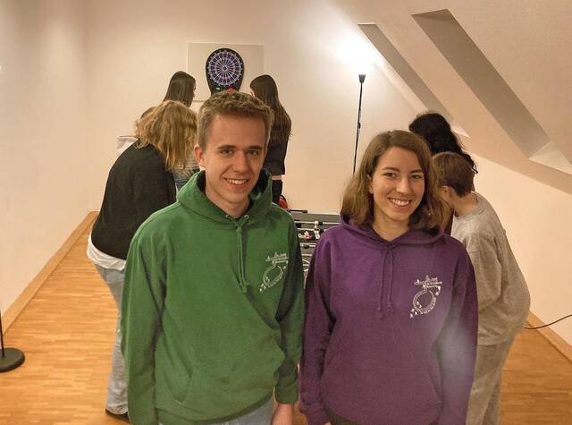 Im Einsatz: Ben Denecke und Lisa Klindworth leiten den Jugendtreff, im Hintergrund wird an der Dartscheibe und am Krökeltisch gespielt.Foto: Stephan Hartung