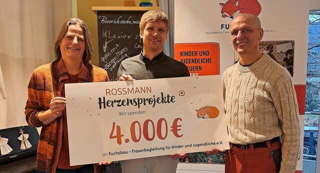 Fuchsbau-Leiterin Neuber dankte Hofmann für die großzügige Spende: „Der Fuchsbau ist seit 2023 ein eigenständiger, komplett auf Spenden angewiesener Verein. Durch die fortwährende Unterstützung seitens Rossmann konnte unsere Arbeit hier im Lebenshaus für mehrere Monate sichergestellt werden.“ Sie ergänzte: „Dabei sind es nicht nur die Großspenden, die wichtig sind: Gerade in den Wochen vor Weihnachten haben viele herzensgute Menschen unsere Arbeit auf vielfältige Weise unterstützt und gewürdigt: vom jungen Erwachsenen, der vor Jahren als Kind vom Fuchsbau in seiner Trauer aufgefangen worden ist und nun etwas zurückgeben möchte bis hin zu einem Rentner, der uns trotz Krücke eine schwere Glasschale mit Münzen und Scheinen vorbeigebracht hat.“
