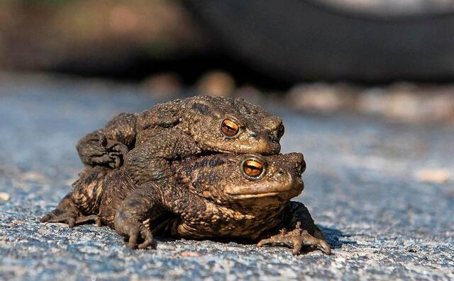 Ein Kröten-Pärchen sitzt auf einer Straße: Aufgrund der steigenden Temperaturen beginnt bereits die Amphibienwanderung am Deister..Foto: Daniel Bockwoldt