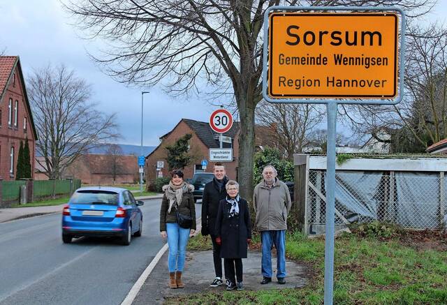 Rückblende ins Jahr 2024: Vorübergehend wurde Tempo 30 auf den Ortsdurchfahrtsstraßen von Sorsum eingeführt – zur Freude der Ortsratsmitglieder Claudia Nolting (von links), Renate Bury-Uhlendorf und Peter Homeyer, sowie des Ratsherrn Jonas Farwig (Zweiter von links).Foto: Heinz-Peter Homeyer