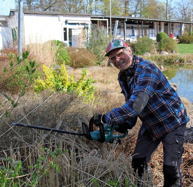 Einige Meter weiter ist Wolfgang Schiemann beschäftigt. Er hat Kopfhörer auf den Ohren – aber nicht nur zum Schutz vor dem Krach seiner elektrischen Heckenschere. „Ich höre Musik, dabei kann ich mich besser konzentrieren“, sagt er. Für den Grünschnitt, den er mit sichtlichem Engagement für „seinen“ Wasserpark absolviert („Ich lebe seit 1982 in Wennigsen“), hat er sein eigenes Gerät mitgebracht.